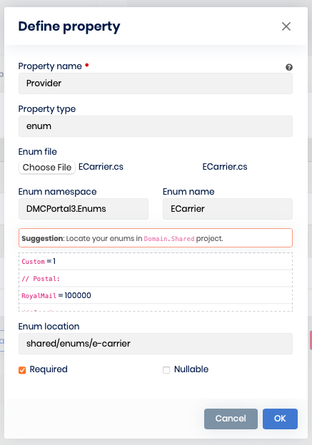 public enum ECarrier { Custom = 1, // Postal: RoyalMail = 100000, // Carrier: Dhl = 200000, Dpd = 201000, Yodel = 202000 }Kind Regards, AJ.