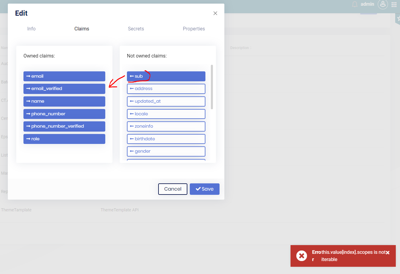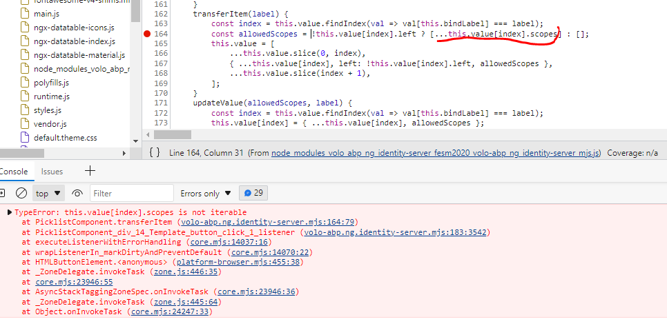 0I was unable to find "Bugs & Issues v7.0.1" (this is the version the bug below is reproduced), we are not planning to update to 7.2.x for the moment, but we need "Identity Server" section working ASAP. SO... After upgrading from ABP 5.1.2 to 7.0.1 I cannot add a claim to "Owned" When I'm trying to move any claim from right to left: I am getting JS exception (because the given property is "undefined"): The same goes for Identity Resources (and maybe other sections like this). FYI: we keep using Identity Server, not Open ID Dict - probably it has something to do with this. Version7.0.1 User InterfaceAngular Database ProviderEF Core (Default) Tiered or separate authentication serverSeparate Auth Server Operation SystemWindows (Default)