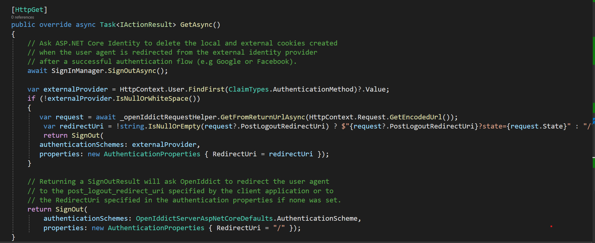 [Route("connect/logout")] [ApiExplorerSettings(IgnoreApi = true)] [Dependency(ReplaceServices = true)] [ExposeServices(typeof(LogoutController))] public class MyLogoutController : LogoutController { [HttpGet] public async override Task<IActionResult> GetAsync() { await SignInManager.SignOutAsync(); var post_logout_redirect_uri = HttpContext.Request.Query["post_logout_redirect_uri"].ToString(); return SignOut(authenticationSchemes: "AzureAD" , properties: new AuthenticationProperties() { RedirectUri = post_logout_redirect_uri.Replace("signout-callback-oidc", "") }); } } -