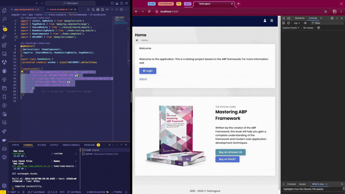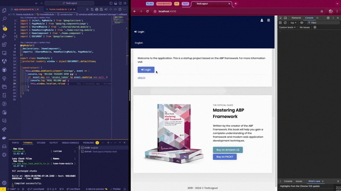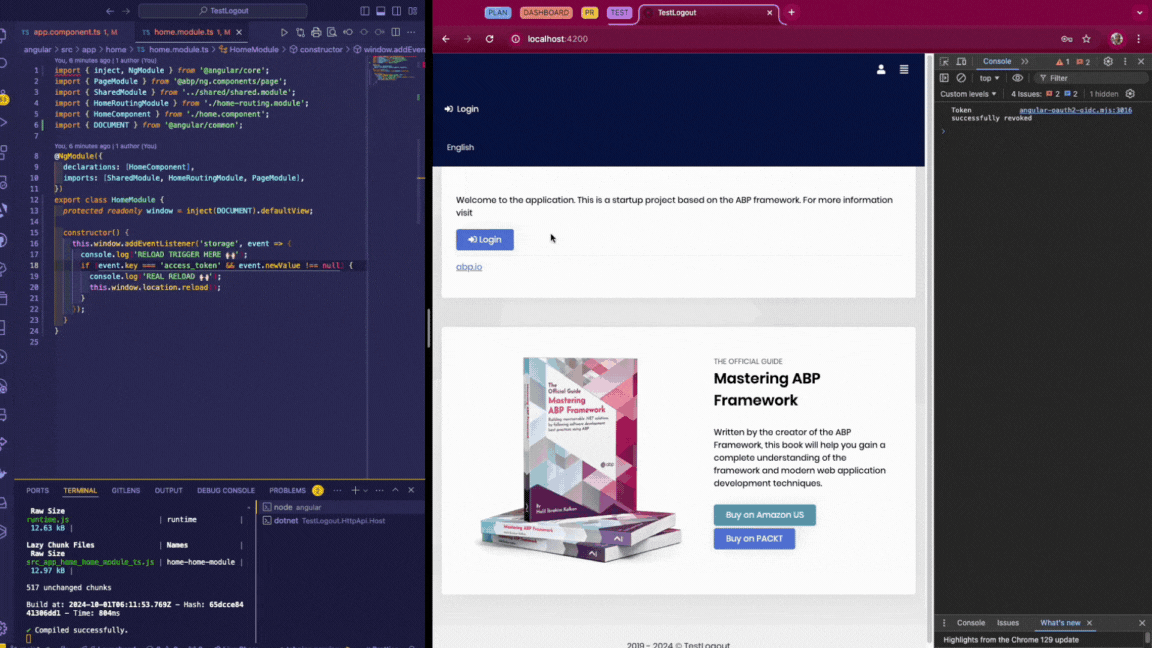 app.component.ts:this.window.addEventListener('storage', event => { if (event.key === 'access_token' && event.newValue === null) { this.window.location.reload(); } });after logging out in any tab, I am logged out in another tab thanks to this code. So far so good...