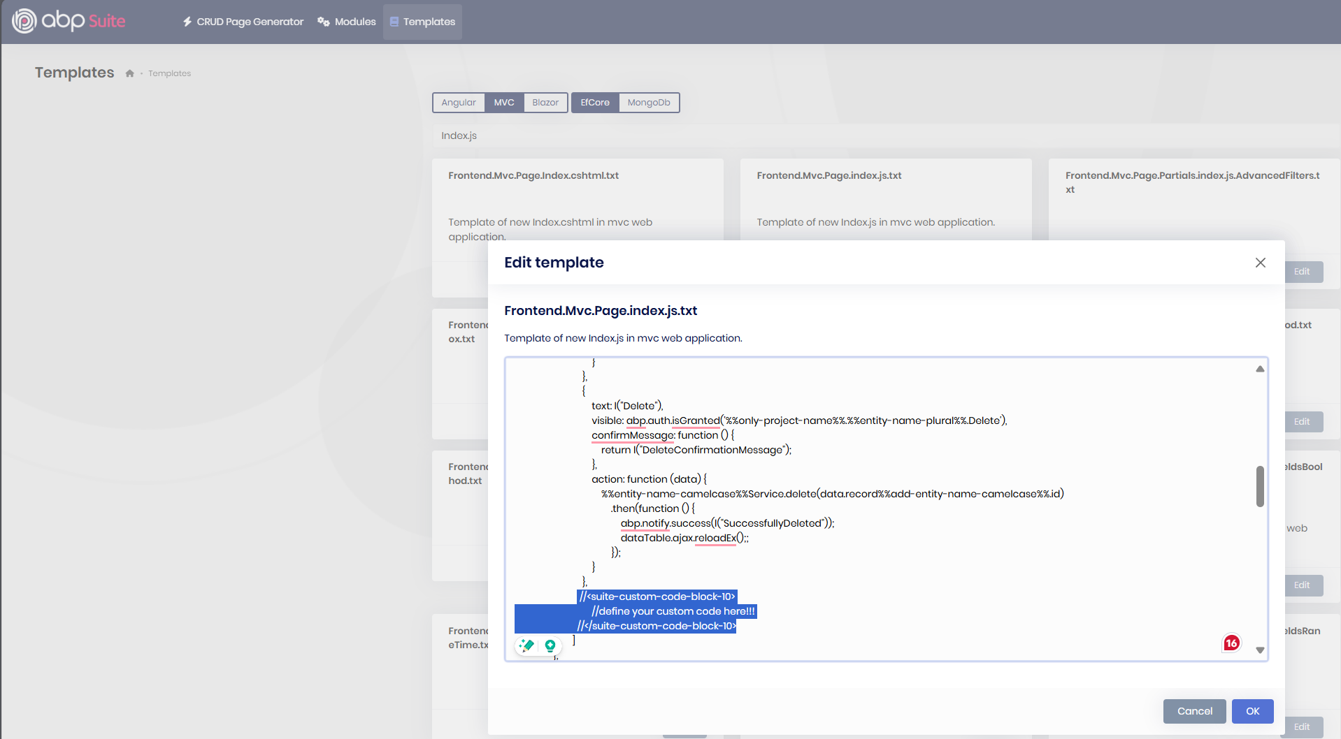 //<suite-custom-code-block-10> ,{ text: l("ClickHere"), action: function (data) { //define what should happen when to the action clicked } }, //</suite-custom-code-block-10>3-) Then in the next code generations, ABP Suite will respect your change, and will not override the specified section.