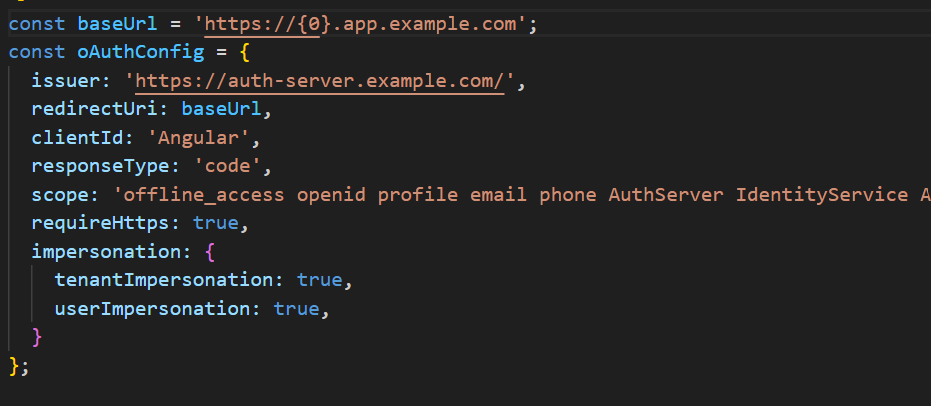 For example: Angular : https://tenant1.app.example.com AuthServer: https://auth-server.example.com?__tenant=tenant1