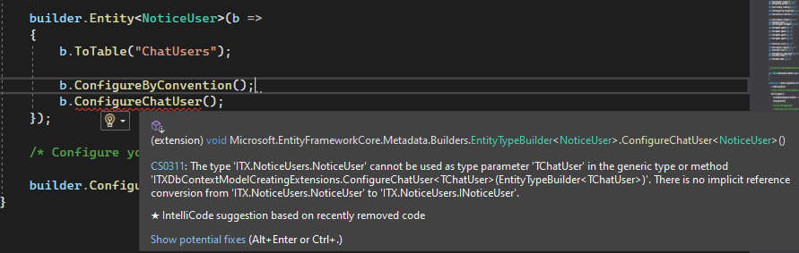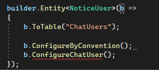 This is my code for one of the 4 entities for the ModelBuilders What I did is to create my entity builder as below and set my To Table to ChatUser in place of NoticeUser