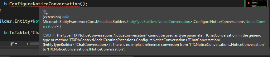 What I have done is recreate the 4 Entities used by the Volo Chat modules with the required CRUD functionality. All the changes are working as I want them to. I have but one problem. I can't add migrations, I get the following error. There may be a simple solution that I have not tried. Cannot use table 'ChatConversations' for entity type 'Conversation' since it is being used for entity type 'NoticeConversation' and potentially other entity types, but there is no linking relationship. Add a foreign key to 'Conversation' on the primary key properties and pointing to the primary key on another entity type mapped to 'ChatConversations'.
