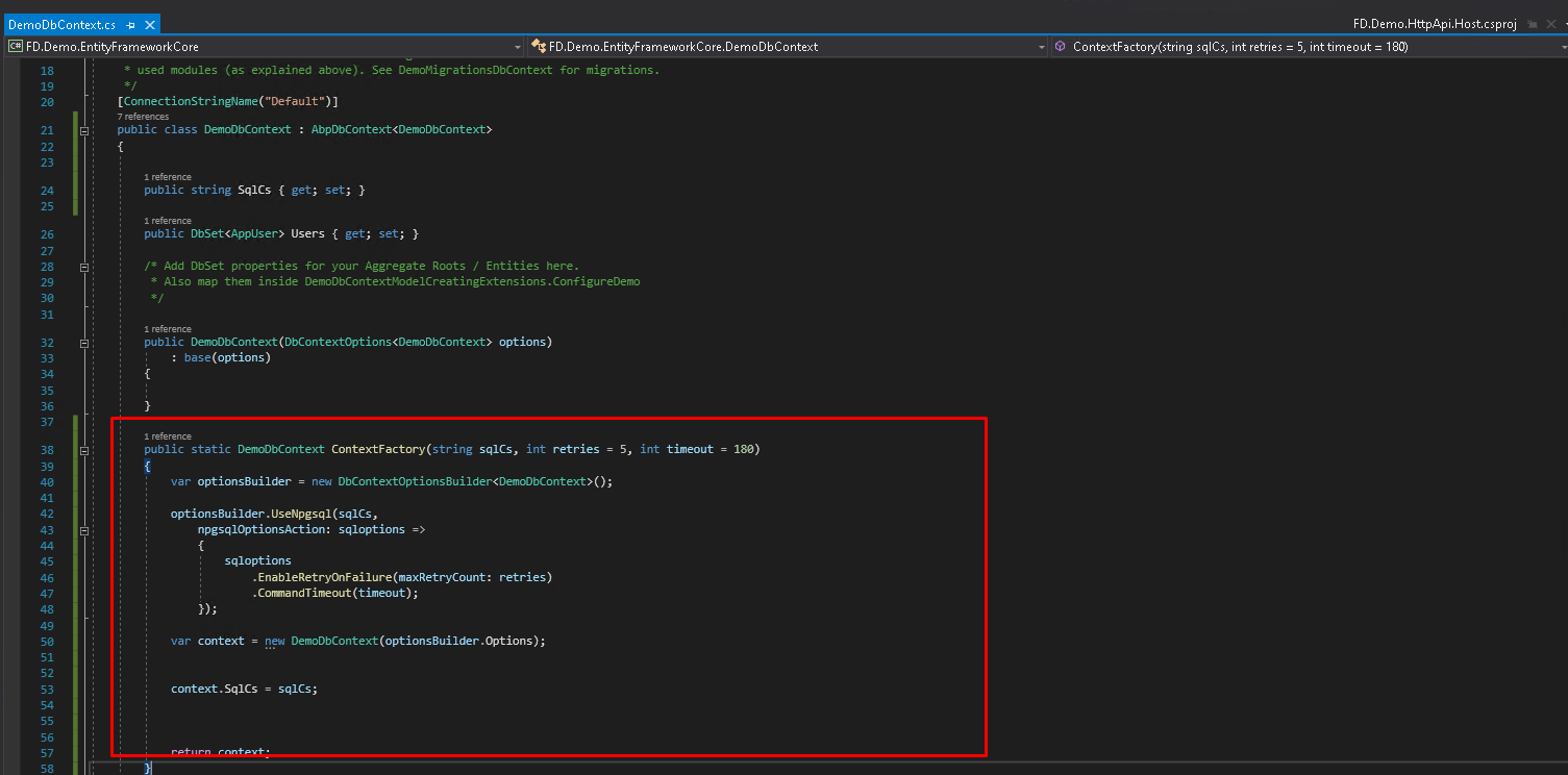 I was trying to switch the database using connection string So I added one method ContextFactory in DbContext.cs file(EntityFrameworkCore layer)