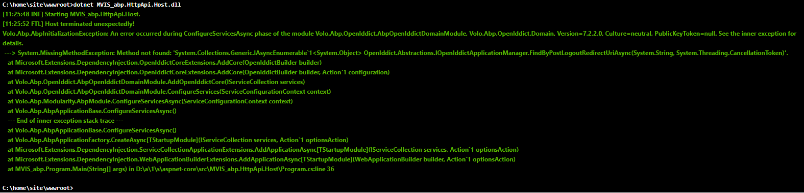 { "App": { "SelfUrl": "https://localhost:44325", "AngularUrl": "http://localhost:4200", "CorsOrigins": "https://*.MVIS_abp.com,http://localhost:4200", "RedirectAllowedUrls": "http://localhost:4200", "DisablePII": "false", "HealthCheckUrl": "/health-status" }, "ConnectionStrings": { "Default": "Server=tcp:XXX,1433;Initial Catalog=XXX;Persist Security Info=False;User ID=XXX;Password=XXX;MultipleActiveResultSets=False;Encrypt=True;TrustServerCertificate=False;Connection Timeout=30;" }, "AuthServer": { "Authority": "https://localhost:44325", "RequireHttpsMetadata": "true", "SwaggerClientId": "MVIS_abp_Swagger" }, "StringEncryption": { "DefaultPassPhrase": "Fi1zhuZcgSTEguJm" } }