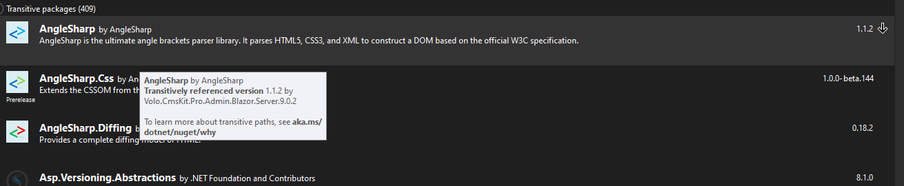 After reviewing the cms pro kit code i found out it directly refrences AngleSharp Version 1.1.2. BUT the also referenced HtmlSanitizer v8.1.870 requires AngleSharp Version 0.17.1.