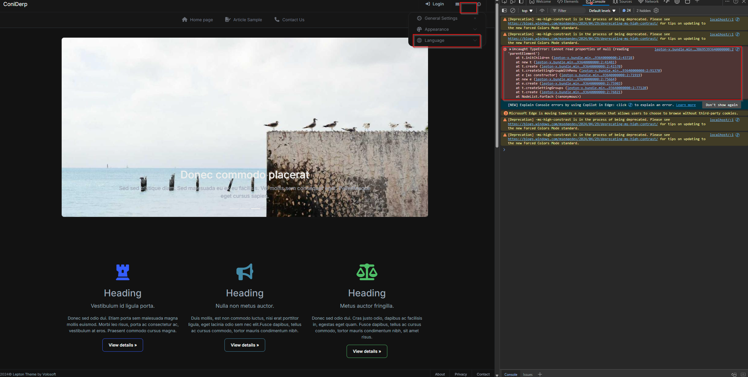 Uncaught TypeError: Cannot read properties of undefined (reading 'querySelector') at e.updateSelected (lepton-x.bundle.min.js?_v=638695393640000000:2:73734) at e.updateAllSelected (lepton-x.bundle.min.js?_v=638695393640000000:2:91910) at e.withPersistedValue (lepton-x.bundle.min.js?_v=638695393640000000:2:91260) at Function.create (lepton-x.bundle.min.js?_v=638695393640000000:2:75931) at t.createSettingGroups (lepton-x.bundle.min.js?_v=638695393640000000:2:77120) at lepton-x.bundle.min.js?_v=638695393640000000:2:76821 at NodeList.forEach (<anonymous>) at lepton-x.bundle.min.js?_v=638695393640000000:2:77884 at lepton-x.bundle.min.js?_v=638695393640000000:2:52556 at Map.forEach (<anonymous>)