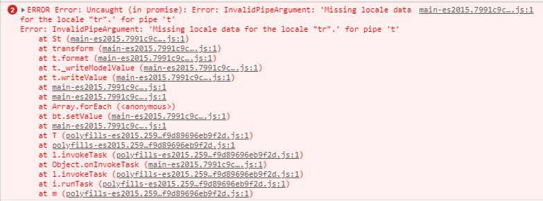 and also when it comes with turkish culture, after you log in datepickers are not workinf properly and console logs this error. "ERROR Error: Uncaught (in promise): Error: InvalidPipeArgument: 'Missing locale data for the locale "tr".' for pipe 't'" but if you click "English" and then click "Türkçe" again it works correctly.