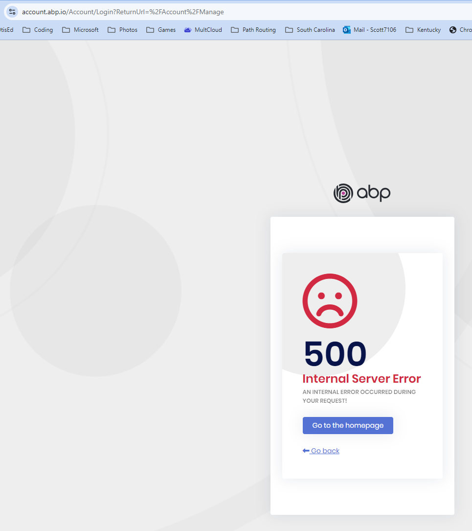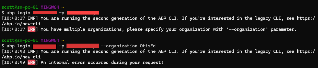 abp login <username> -p <password> is failing. Adding --organization does not fix the problem.