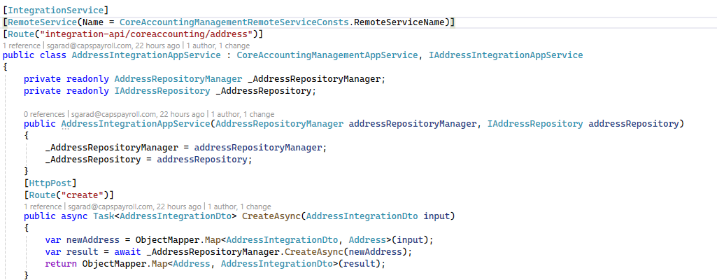 12/7/2024 12:26:38 AM [Information] Route matched with "{action = \"Create\", controller = \"AddressIntegration\", area = \"\", page = \"\"}". Executing controller action with signature "System.Threading.Tasks.Task`1[CastandCrew.NorthStar.CoreAccountingManagement.Dtos.AddressDto] CreateAsync(CastandCrew.NorthStar.CoreAccountingManagement.Dtos.AddressDto)" on controller "CastandCrew.NorthStar.CoreAccountingManagement.Services.Integration.AddressIntegrationAppService" ("CastandCrew.NorthStar.CoreAccountingManagement.Application").