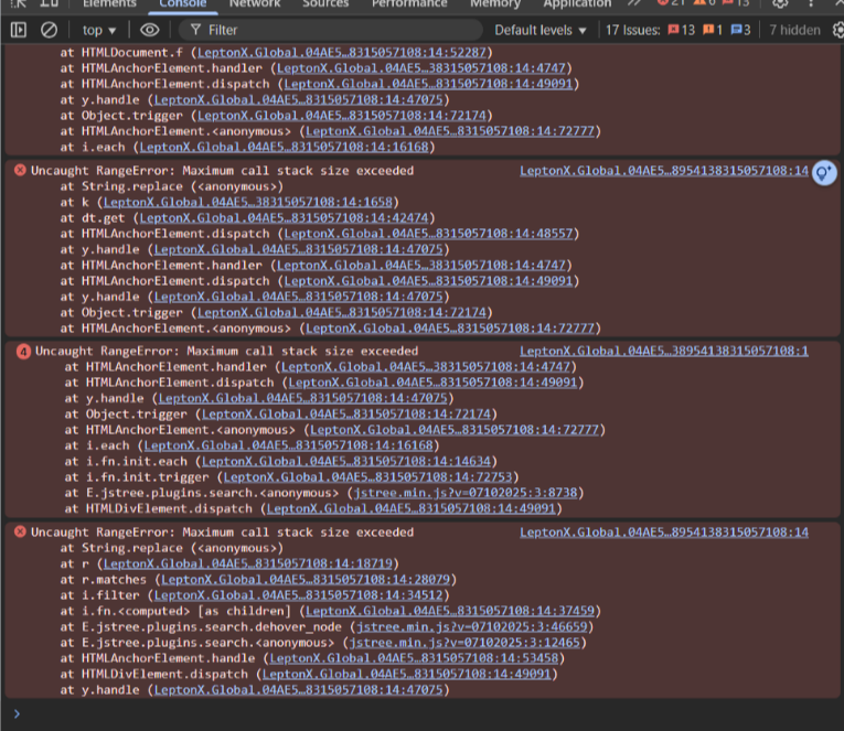 When we click Select All, the system starts selecting organization units but only some of them get selected. Others remain unselected, and the browser console shows multiple Uncaught RangeError: Maximum call stack size exceeded errors.